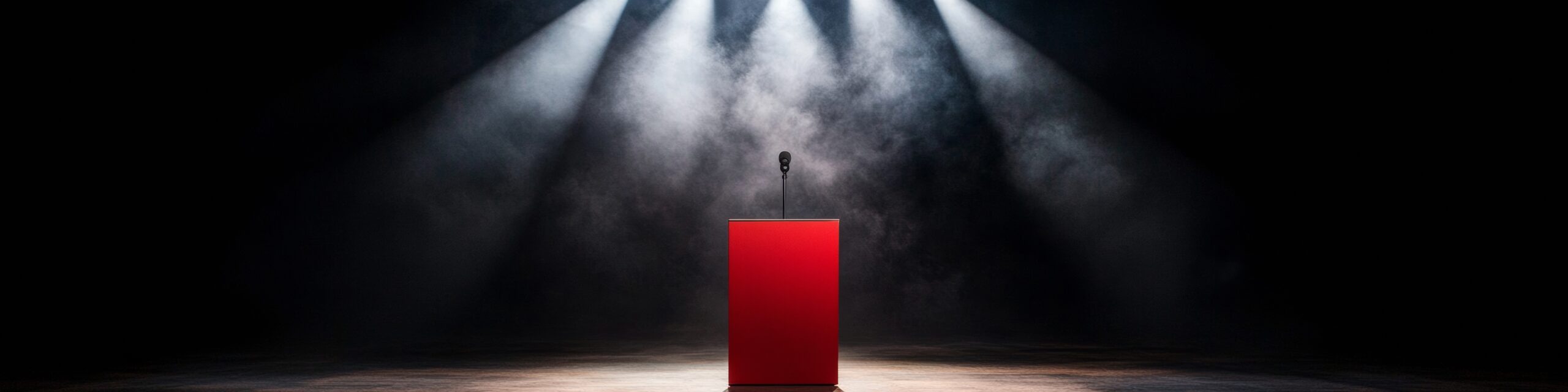 Contemporary Broadcast Studio Design Sleek Red Podium in Minimalist Setting with Dynamic Lighting Elevating Political Media Coverage and Democratic Engagement.
